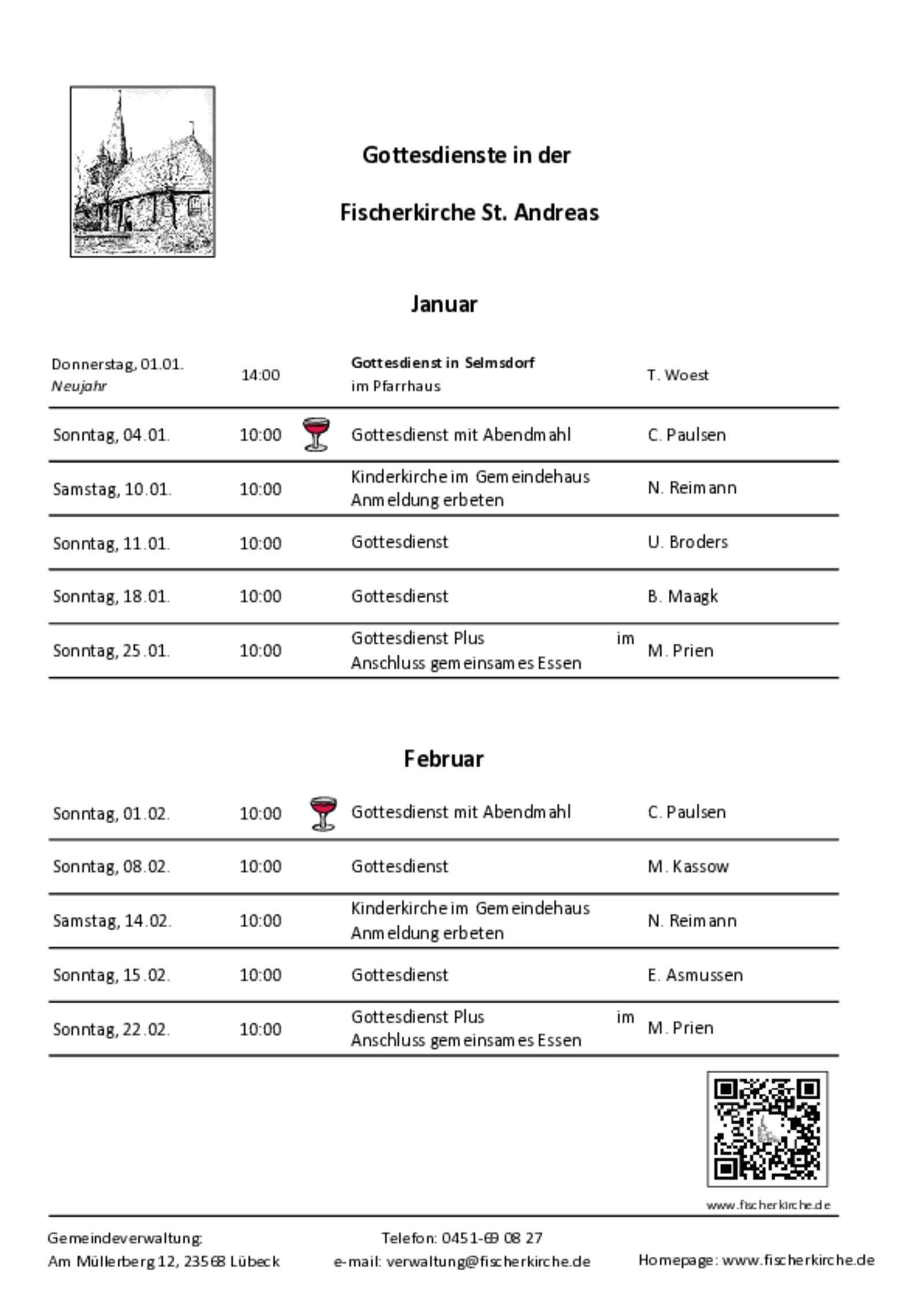 Wir feiern jeden Sonntag um 10 Uhr Gottesdienst in der Fischerkirche St. Andreas, um gemeinsam zu beten, zu singen, Gottes Wort zu hören und Kraft zu schöpfen für den Alltag.