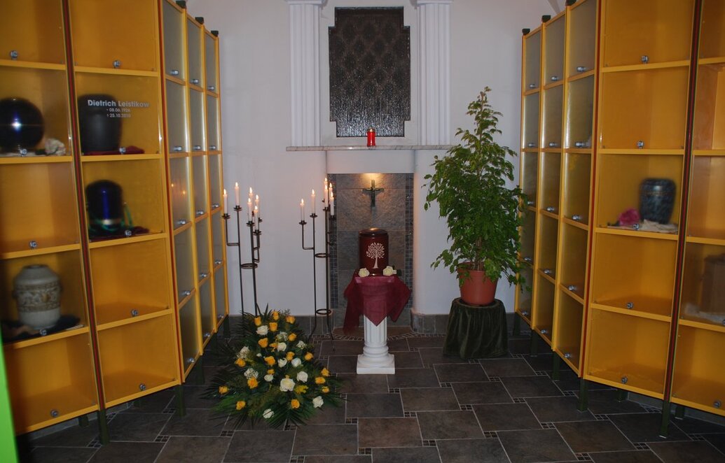 Dort gibt es insgesamt 60 Einzel- und 10 Doppelfächer für die Einstellung von Urnen. Die Nutzungsdauer beträgt 25 Jahre. Das Kolumbarium ist hell und freundlich, aber auch würdevoll gestaltet. Sitzmöglichkeiten sind vorhanden. So kann der Verstorbenen in der Ruhe des Mausoleums mitten im Wald still gedacht werden.