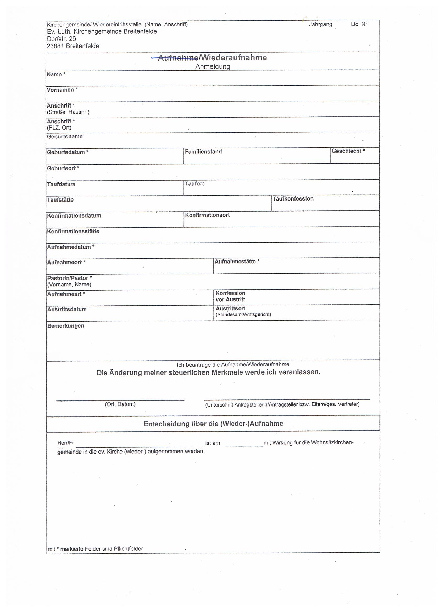 - Sie können das Wiedereintrittformular herunterladen, ausdrucken, ausfüllen, unterschreiben und dann im Kirchenbüro abgeben oder es per Post zusenden.