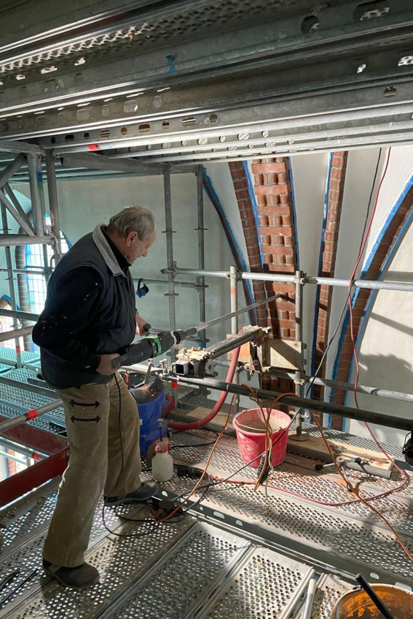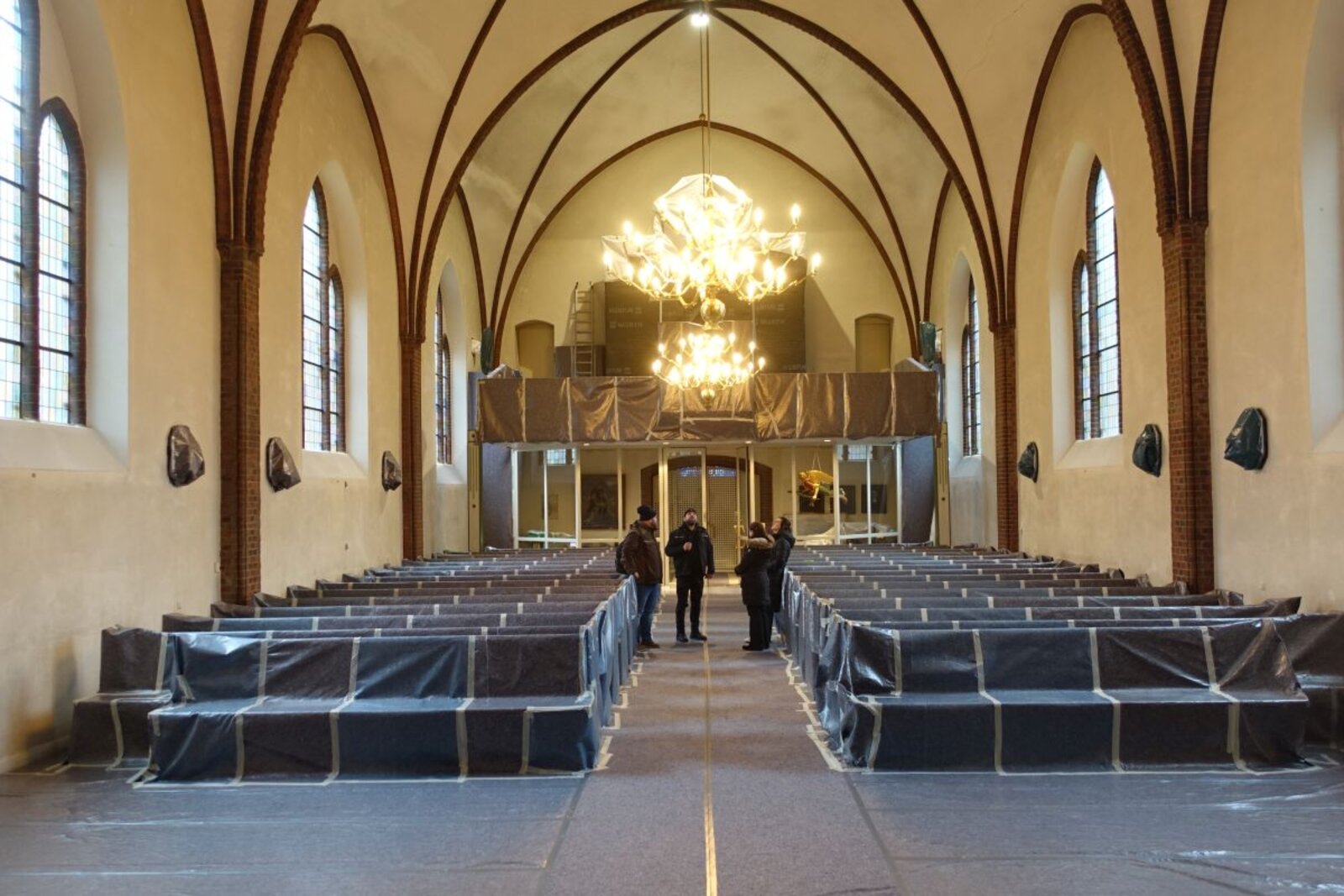 Seit dem Beginn der Arbeiten, die sich auf den Innenraum konzentrieren, schützt Malervlies die Einrichtung vor Staub und Schmutz. „Es sieht aus wie ein Werk des Verhüllungskünstlers Christo“, schmunzelt Schöer. Im nächsten Schritt wird ein Gerüst mit einer Plattform aufgebaut, das sich über das gesamte Kirchenschiff erstreckt. Zur Stabilisierung der Kirche werden dauerhaft drei Stahlrohre eingesetzt, die im Innenraum sichtbar bleiben.