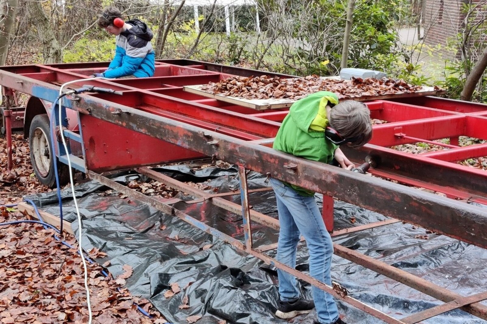 Nach dem Abriss des alten Aufbaus ging es im Frühjahr 2022 darum, das Fahrgestell wieder zum Glänzen zu bringen. Es ging ans Schleifen, Entrosten, Grundieren und Neu-Lackieren, eine mühsame Arbeit. Immer samstags traf sich, wer Zeit und Lust hatte, am Bauwagen um zu werkeln. Nach dem Corona-Winter war im Frühjahr das Bedürfnis nach Geselligkeit bei den Jugendlichen groß. Man wollte sich nicht nur zum Bauen treffen. So entstanden im Team viele Ideen zu Kreativ-Workshops.