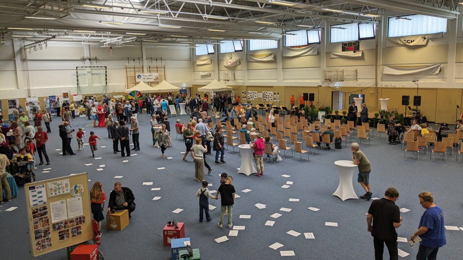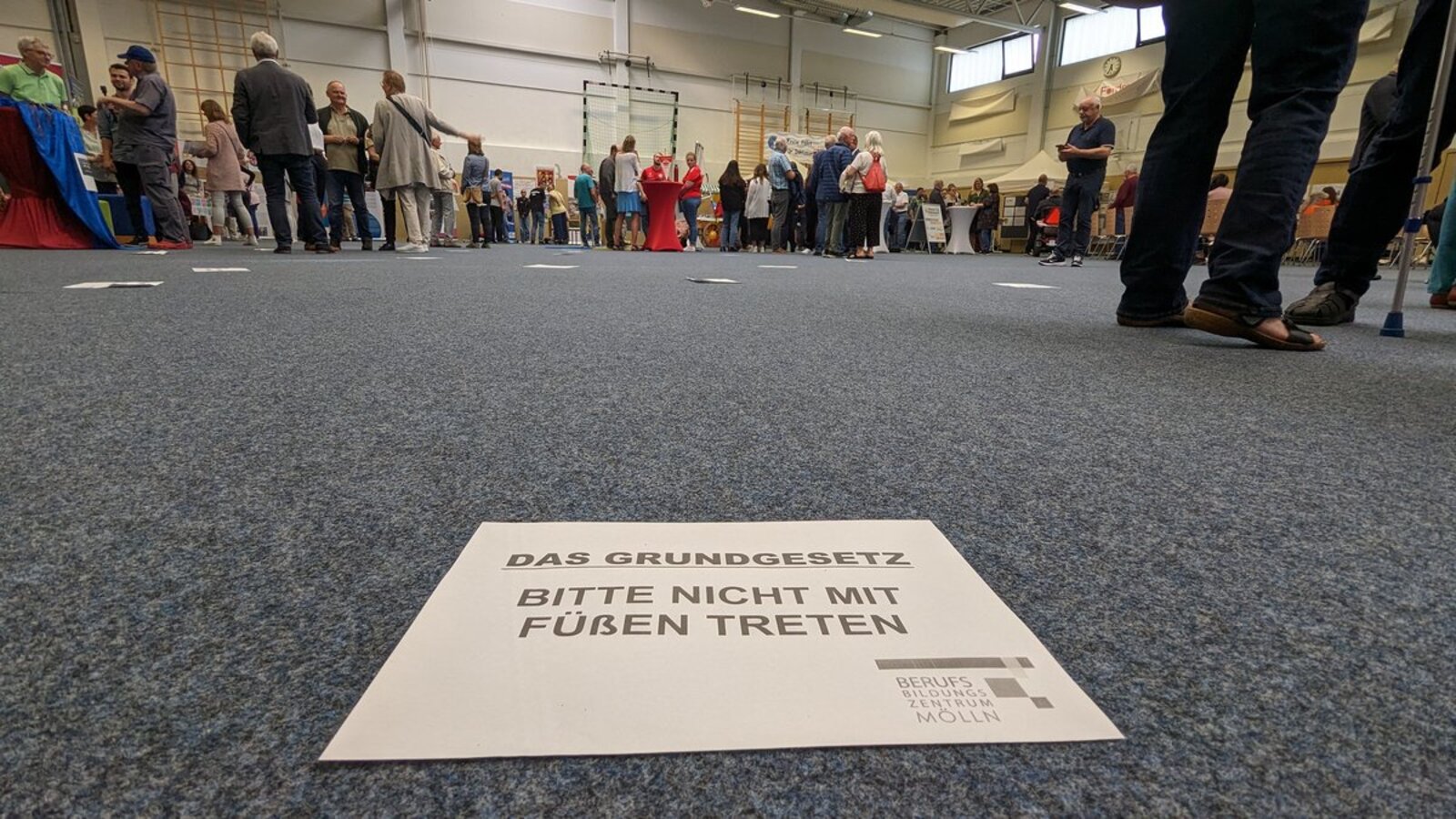 Alle waren gekommen: Die Stadt Mölln war ebenso dabei wie das Land Schleswig-Holstein, zahlreiche Schulen, der Kirchenkreis Lübeck-Lauenburg, viele soziale Organisationen, die Omas gegen Rechts – und natürlich Till Eulenspiegel und viele Möllner. An diesem frühen Donnerstag ist die Stadtwerke-Arena gut gefüllt. Lebendiges Stimmengewirr empfängt die Besucher. Und die müssen aufpassen, wo sie hintreten. Denn auf dem Boden der Sporthalle liegen Hunderte Zettel. „Das Grundgesetz – bitte nicht mit Füßen treten“ steht auf ihnen oder „Das Grundgesetz – Lass es nicht links liegen“.
