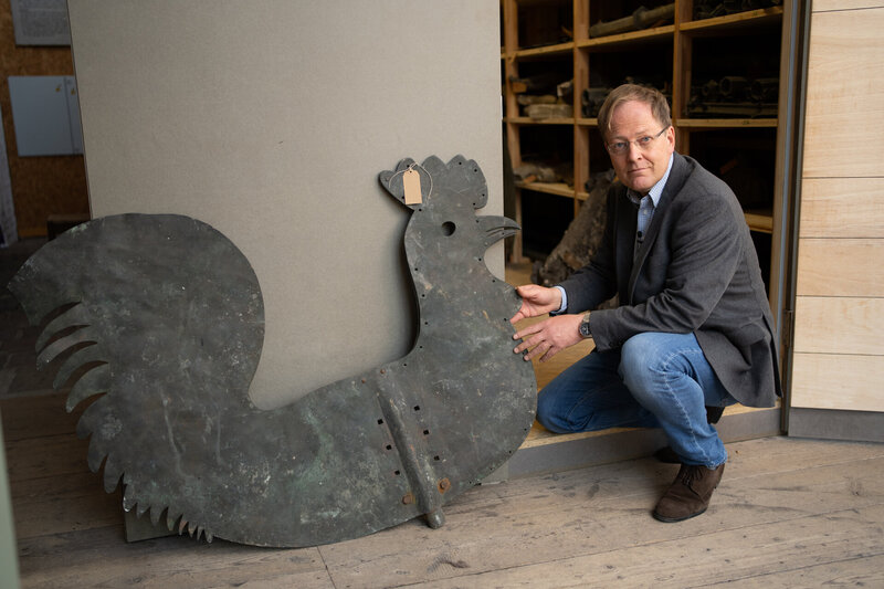 Beide Wetterhähne stürzten bei den Bombenangriffen in der Palmsonntagnacht 1942 beim Einsturz der Türme herab. Nur einer konnte später aus den Trümmern der Lübecker Altstadt geborgen werden – heute ein zentraler Teil des Lapidariums.