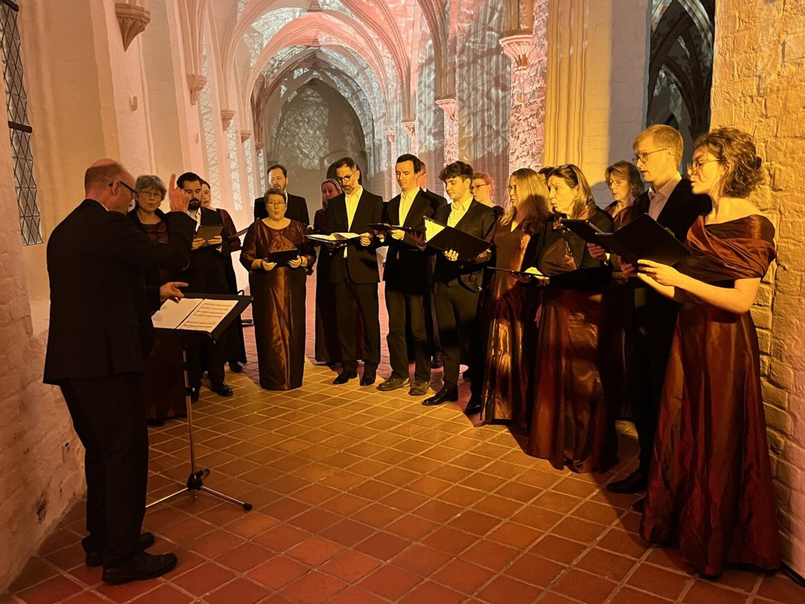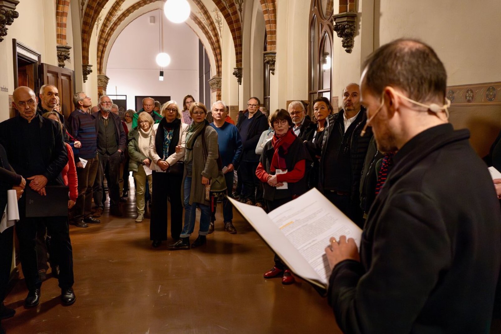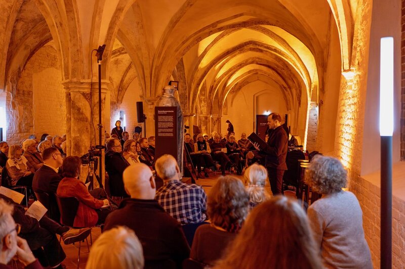 Musikalisch umrahmt wurde der Abend vom Kammerchor „I Vocalisti“ unter der Leitung von Hans-Joachim Lustig. Schauspieler des Theater Combinale und des Theater Lübeck, Ludwig-Christian Glockzin und Vincent Türpe, lasen an wechselnden Orten - im orangefarbenen Scheinwerfer-Licht im Langen Saal oder im kalten Licht des ehemaligen Gerichtstrakts - aus Briefen der Märtyrer an ihre Familien oder an Weggefährten vor. Die Hausdurchsuchung durch die Gestapo, die Willkür der Justiz, die Leere der Haft, die Gedanken an das nahende Ende. Beinahe greifbar - spürbar waren die Gefühle und Gedanken der vier Geistlichen, denen trotz allem zwei Dinge nicht verloren gingen: ihr Mut, Haltung zu zeigen, die Wahrheit auszusprechen, und ihr grenzenloses Vertrauen in Gott.